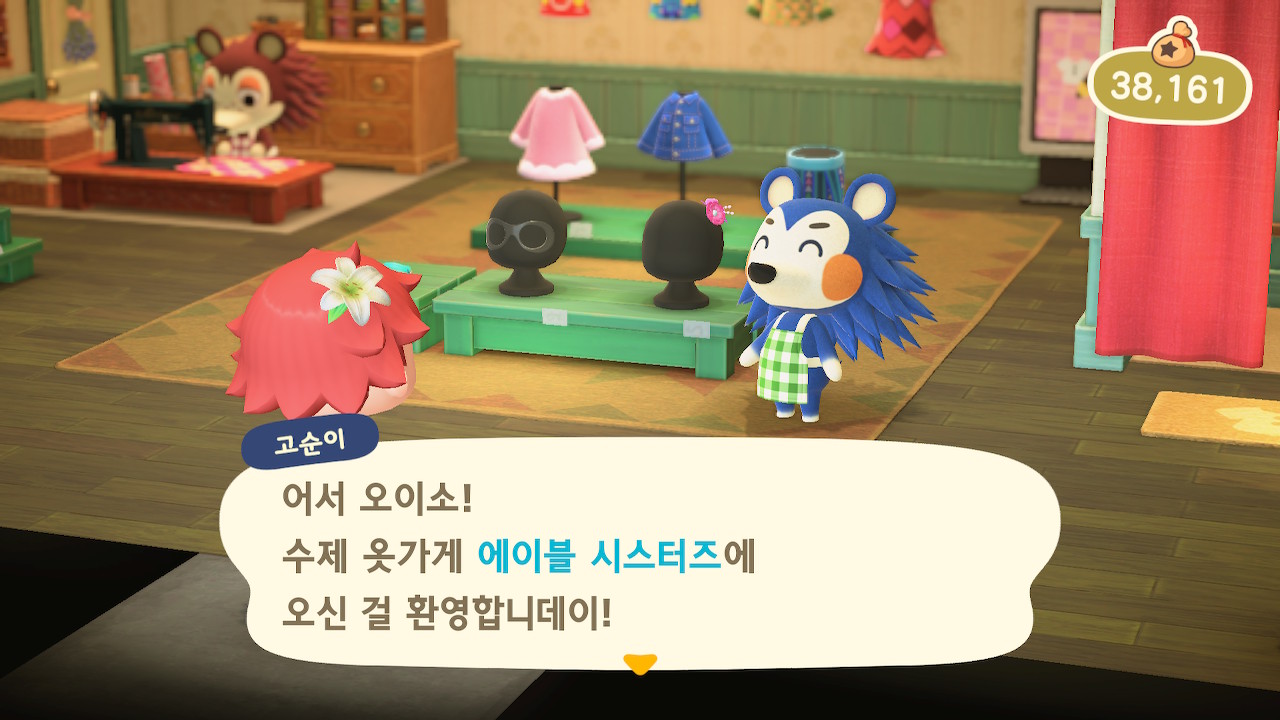 그러면 위치를 정해서 키트를 설치하면 다음날 공사를 하고, 에이블 시스터즈라는 옷가게가 오픈합니다. 에이블 시스터즈는 고순이와 고순이의 언니인 고옥이가 운영을 하고 있습니다. 구석에서는 고옥이가 하루 종일 옷을 만드는 걸 볼 수 있는데 말을 걸면 매일 바쁘다고 대화가 이어지지 않는데요, 매일매일 말을 걸면 보상이 있다고 해서 저도 도전 중입니다.