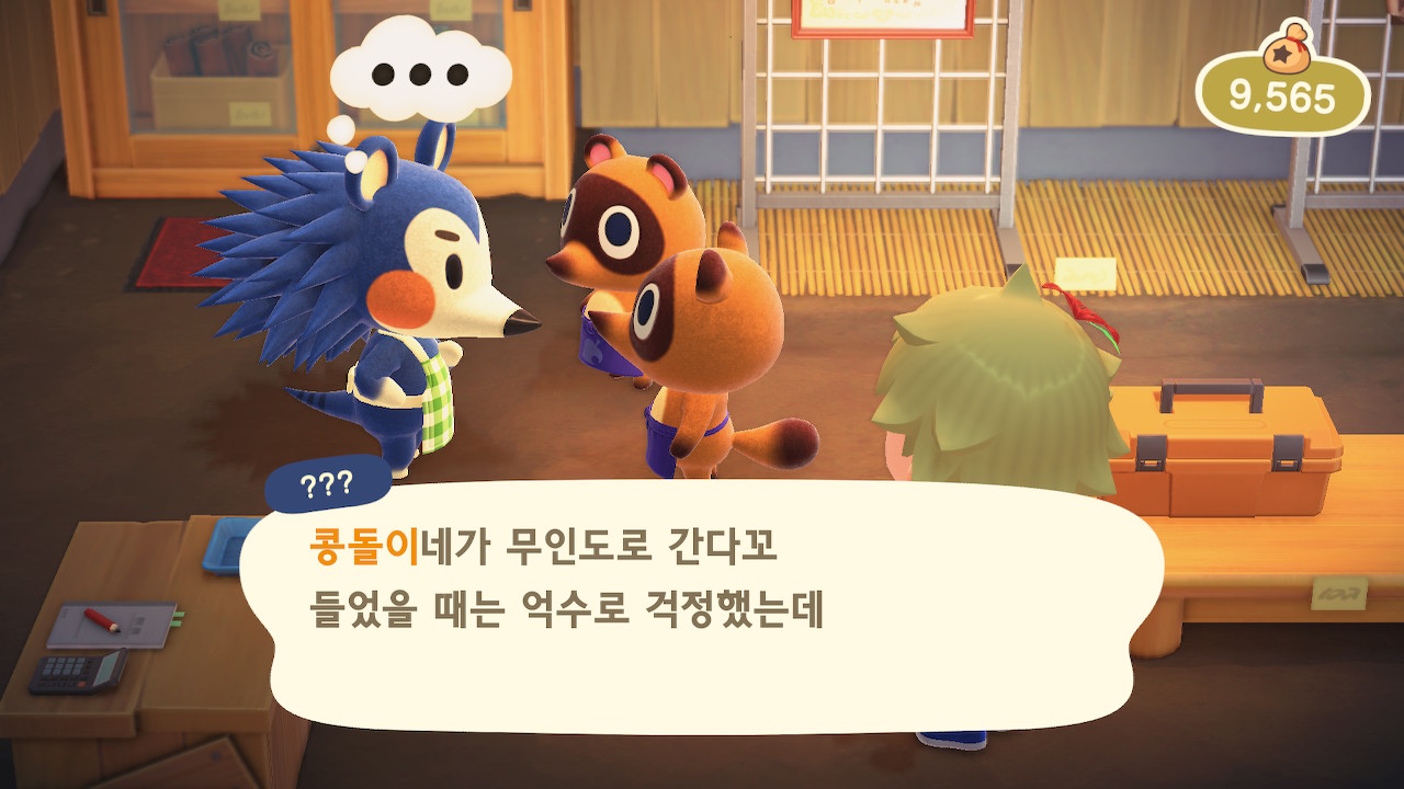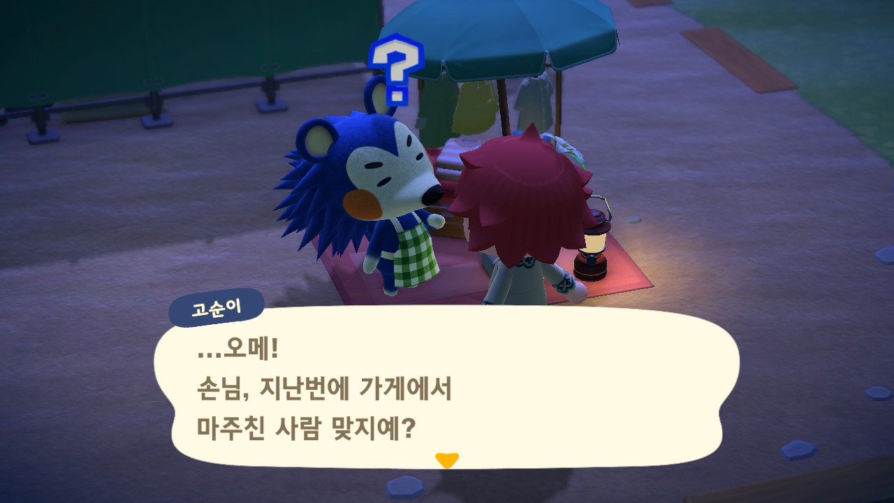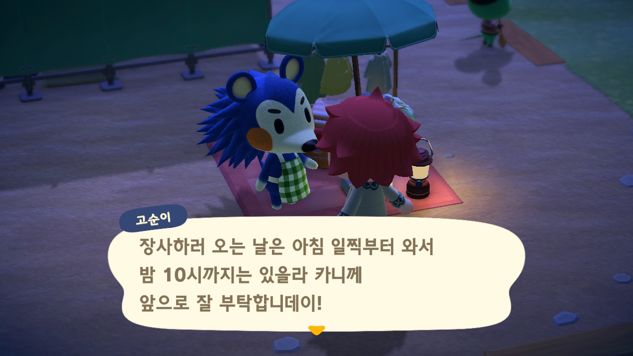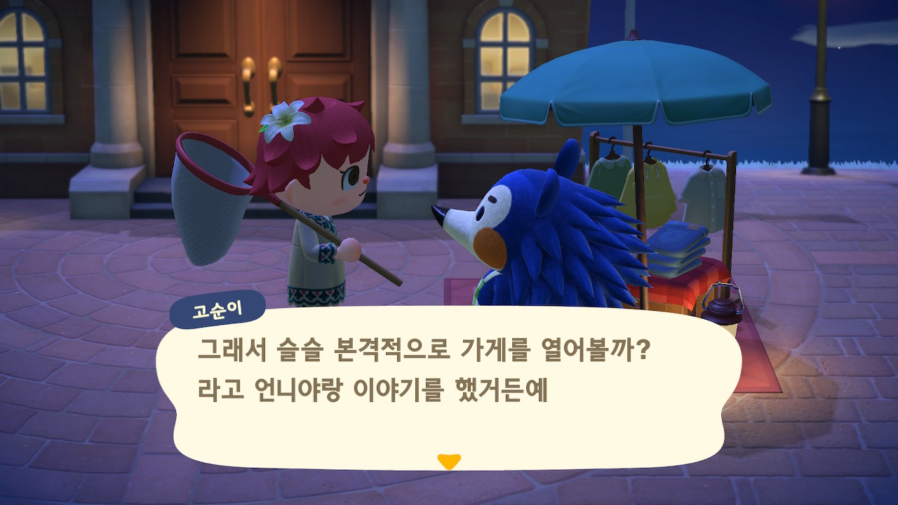 동물의 숲 플레이 일지 3번째, 시간 순이 아니라 의식의 흐름대로 쓰는 플레이 일지입니다. 얼마 전 너굴 상점이 완공이 되고, 상점에 가니 소닉 같은 동물이 있었습니다. 가게 오픈도 축하할 겸 보러 왔다고 대화를 하고 있는 걸 볼 수 있습니다.
