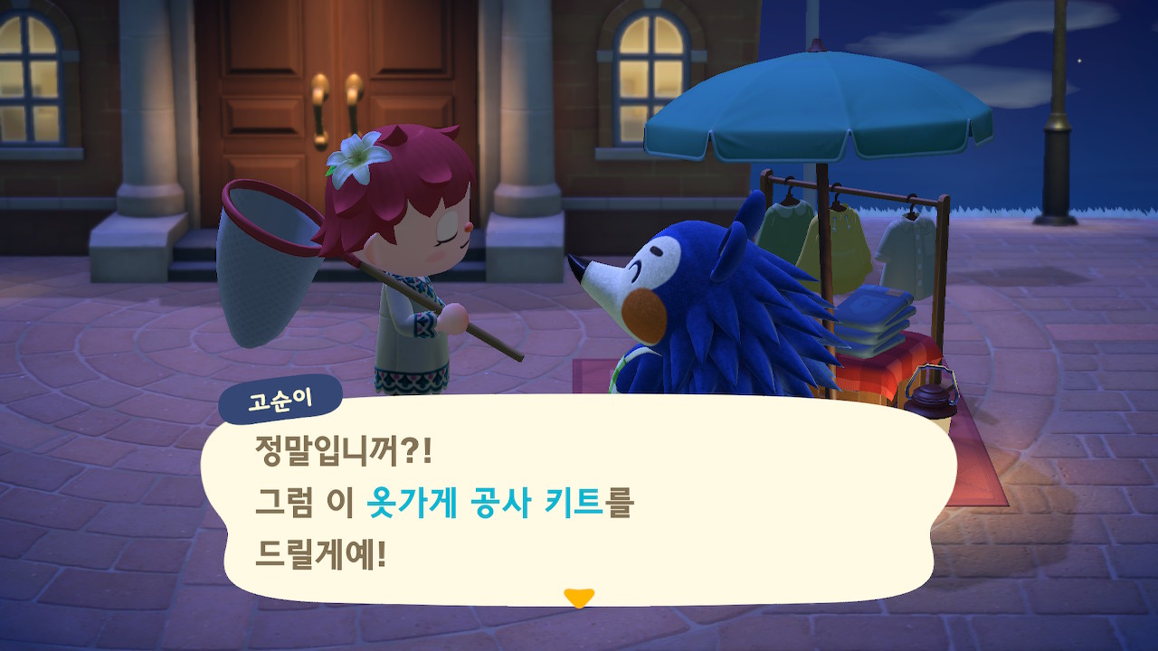 이렇게 광장에 있는 고순이를 2~3번 정도 만난 거 같은데, 매번 볼 때마다 옷을 샀더니 상담드릴 게 있다며 말을 걸어옵니다. 이 부분은 일정 금액 이상 구매하면 진행이 된다고 합니다. 이렇게 말을 걸어오면 이제 섬에 정착하고 싶다며 가게를 차리려고 옷가게 공사 키트를 줍니다.
